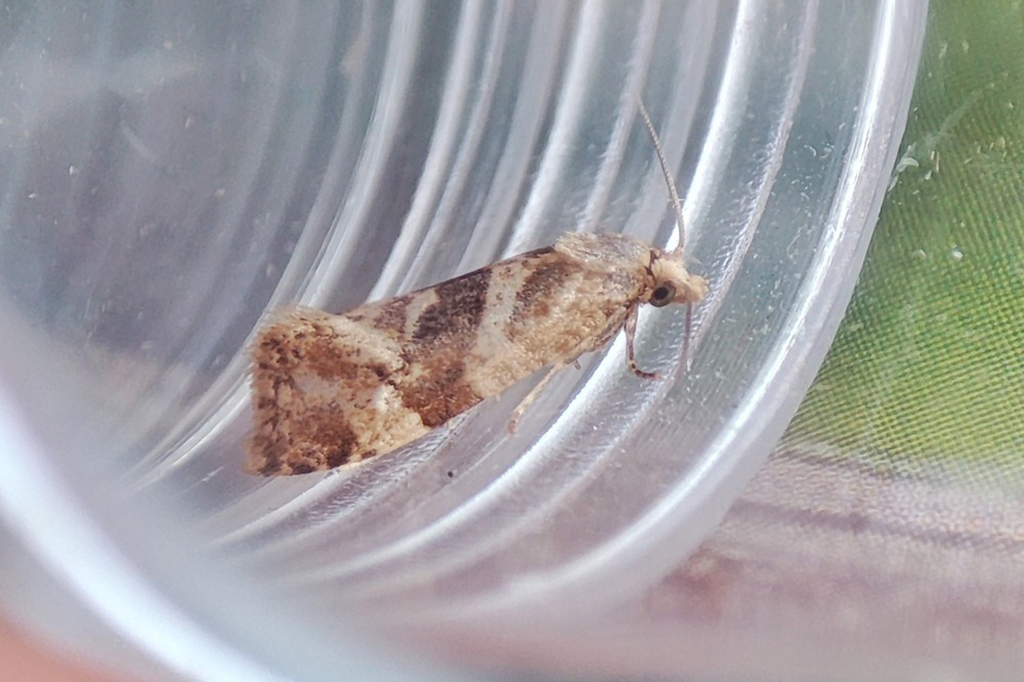 Wingspan 11–14 mm. It is very similar to the other species from the genus Gynnidomorpha and Phalonidia, but is generally distinguished by the strong brown continuous band with a prominent suffusion of blackish scales one third of the way along the central band from the dorsum. This species will also show a darker patch centrally before the termen.