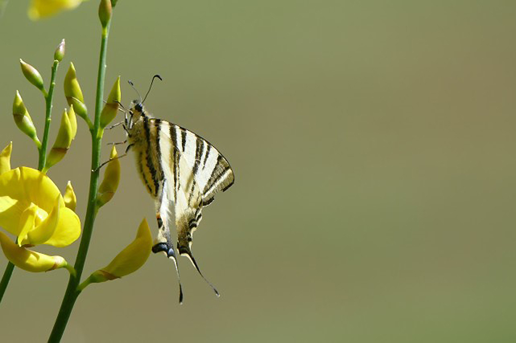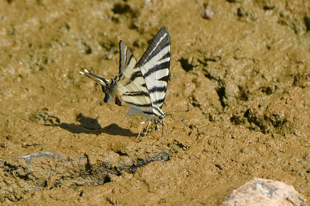 Wing length 32–39 mm. It is an unmistakable large species with a whitish to pale yellow ground colour and black "tiger" stripes crossing the wings. On the outer edge of the hindwing, there are some blue lunules, the inner one topped with orange, and the hindwings have a pair of long conspicuous tails.