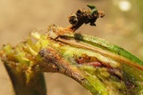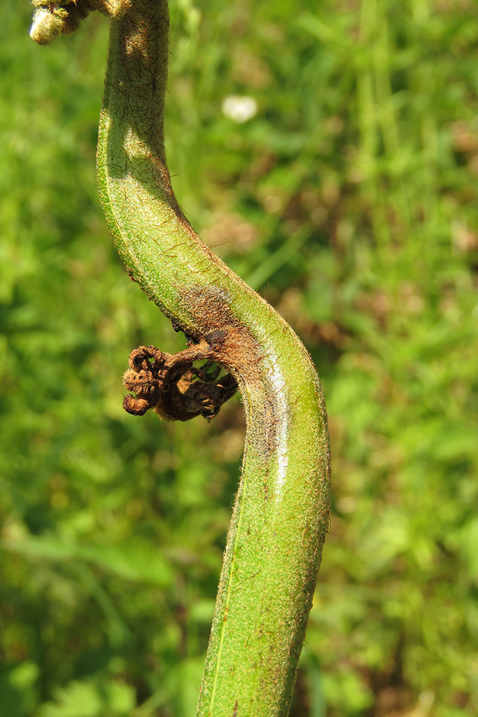 The larva lives inside a slender gall in the main stem or petiole of the food plant. The galls are most easily found in May before the fronds have fully expanded to hide the stem. Pupation among detritus on the ground.