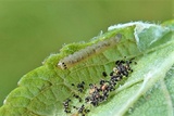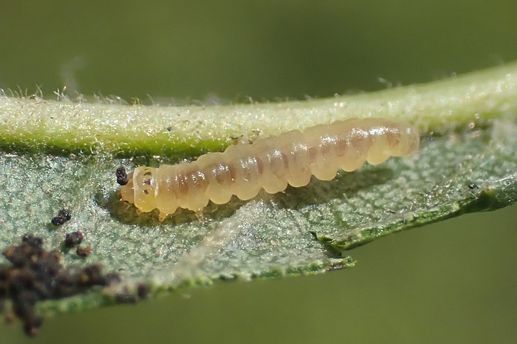 The free-living instars fold a leaf margin downwards and continue feeding on the leaf parenchyma within this fold. On small leaves, this fold can occupy the entire leaf.