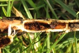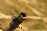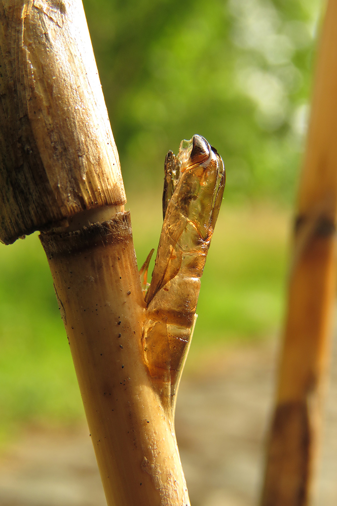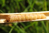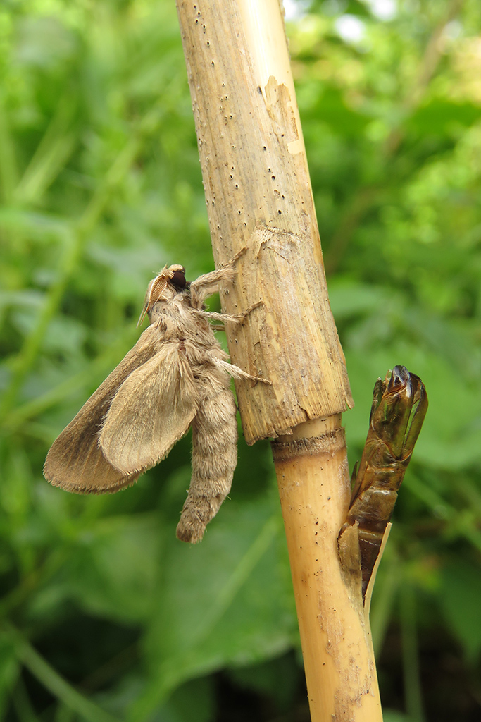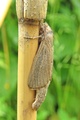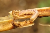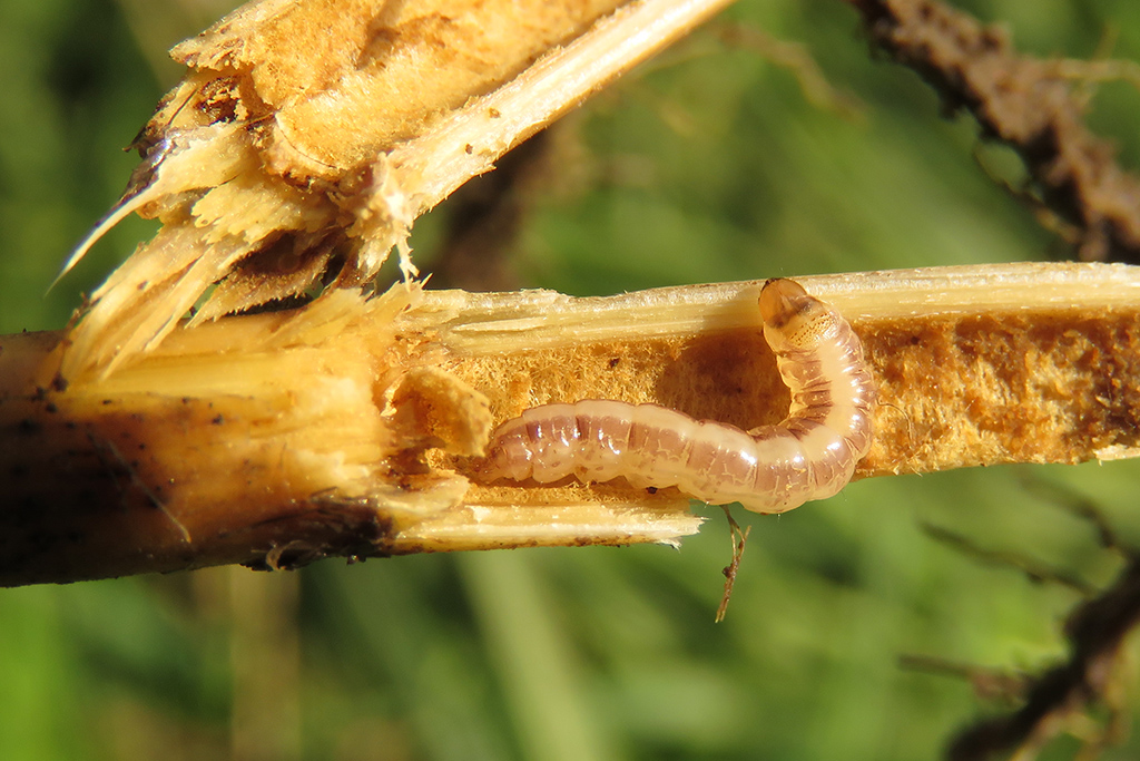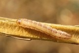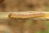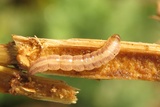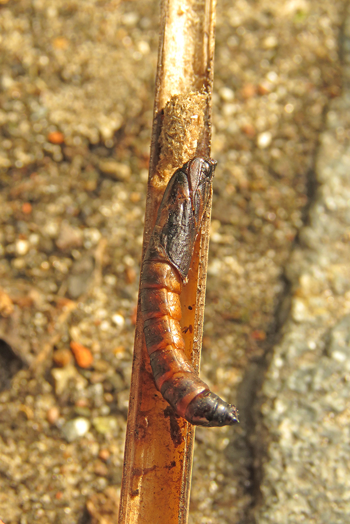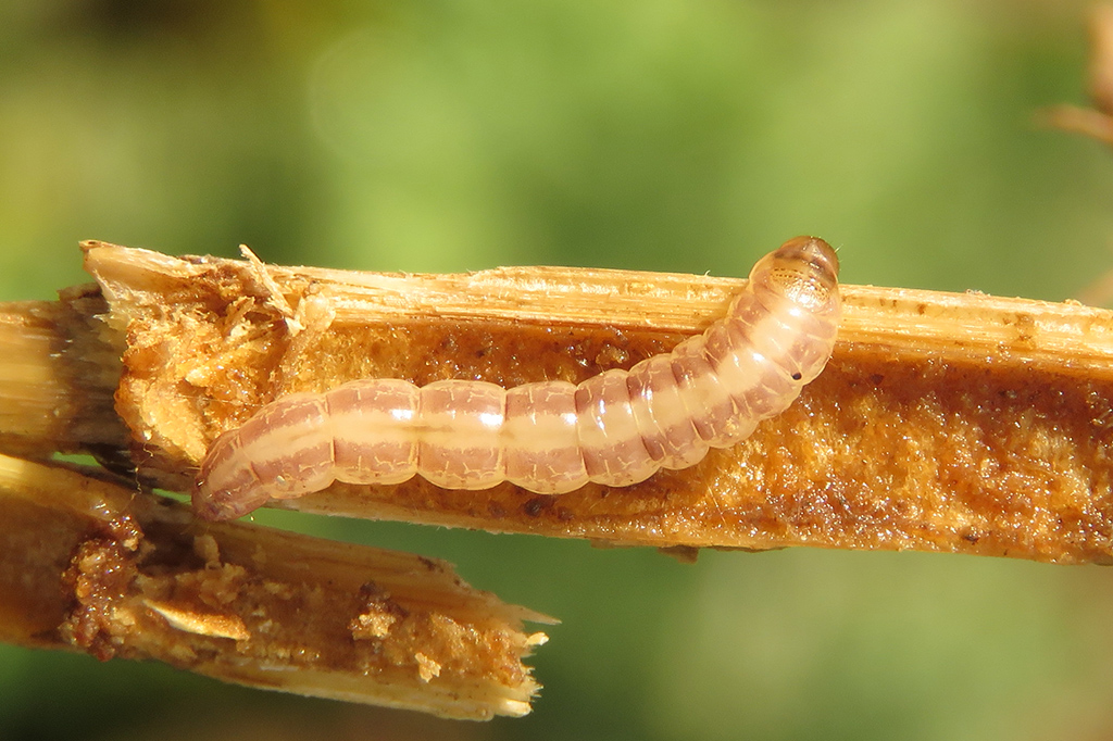 The larva bores in the lower part of the culm, and development takes two years. Occupied stems are noticeably dark inside at the base and contain dark frass (normal stems are more beige or whitish inside), and they usually break off more easily. Pupation in the spring in the upper part of the culm.