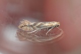 Head brown, with some mixed white scales; forewing ground colour rather dark brown; white, sometimes yellowish white, pattern consisting of a basal line, not edged; a narrow, but mostly long patch at the dorsum near the base, sometimes connected to the first dorsal stria; four costal and three dorsal striae, the first dorsal stria is the longest.
