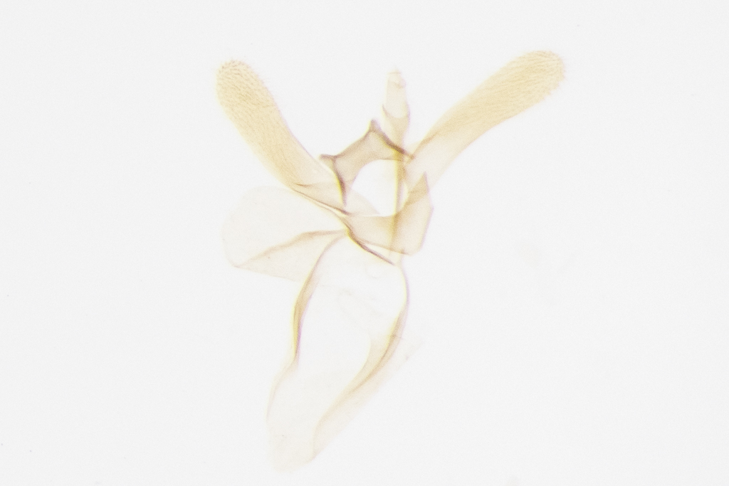 A rather small, semi-circular, tentiform mine on the underside of a leaf, later growing into an elongated mine situated between two secondary veins. One to six longitudinal folds. On the upper side, the mine is visible as a brown patch. The frass is concentrated in a corner of the mine.