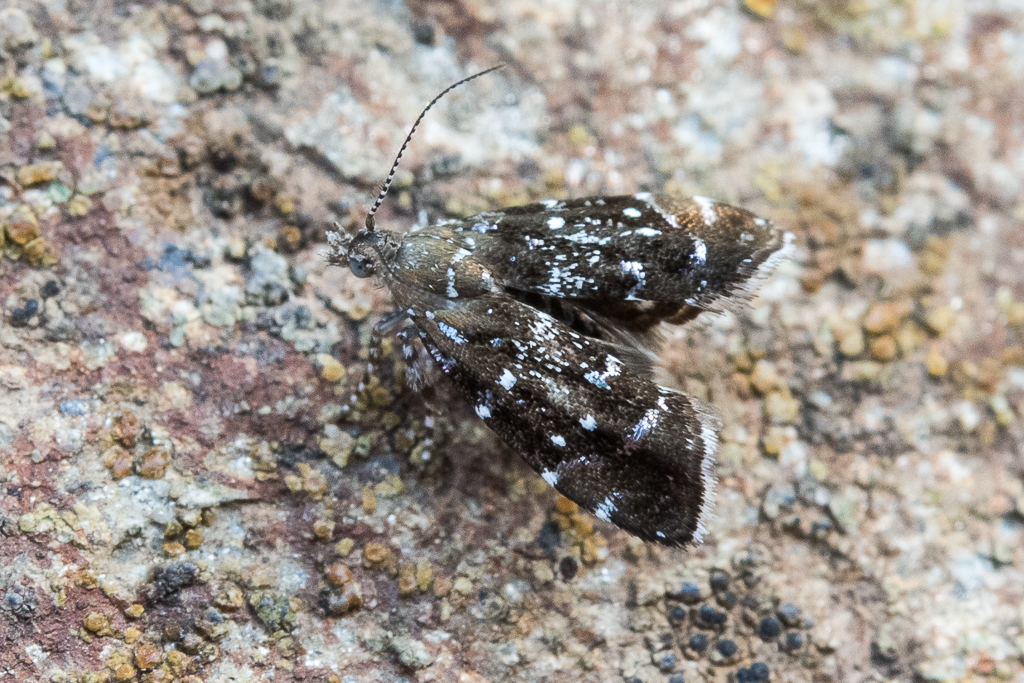 Wingspan 10–14 mm. In the very similar species Prochoreutis sehestediana, the white spots are less clear and also arranged a little differently. This species also has a light brown subterminal fascia that is missing or not so obvious as in P. myllerana.