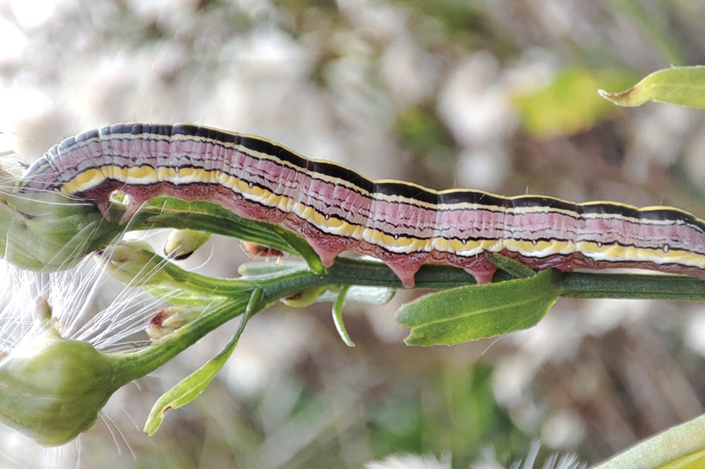 The larva lives on Tripolium pannonicum, Solidago and in gardens it accepts also cultivated Aster.
