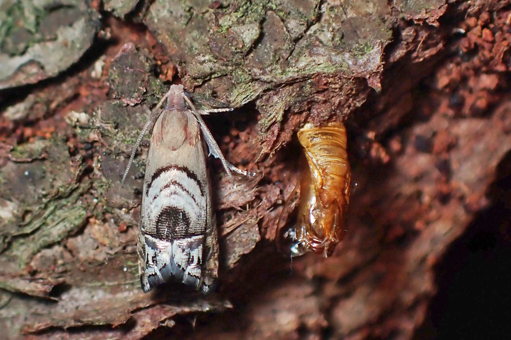 Mines can be found on branches and trunks. Hibernates as mature larvae and pupate in early spring. Adults come to light.