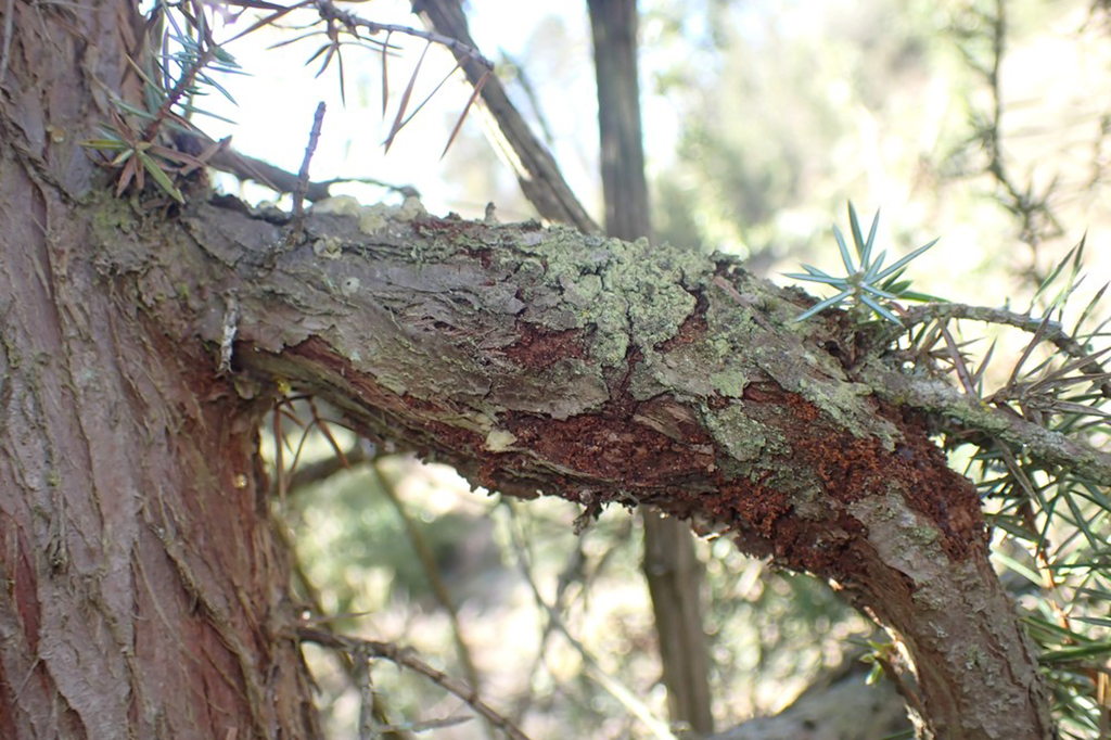 It inhabits gardens and parks planted with cultivated conifers and on calcareous ground with Juniperus.