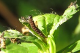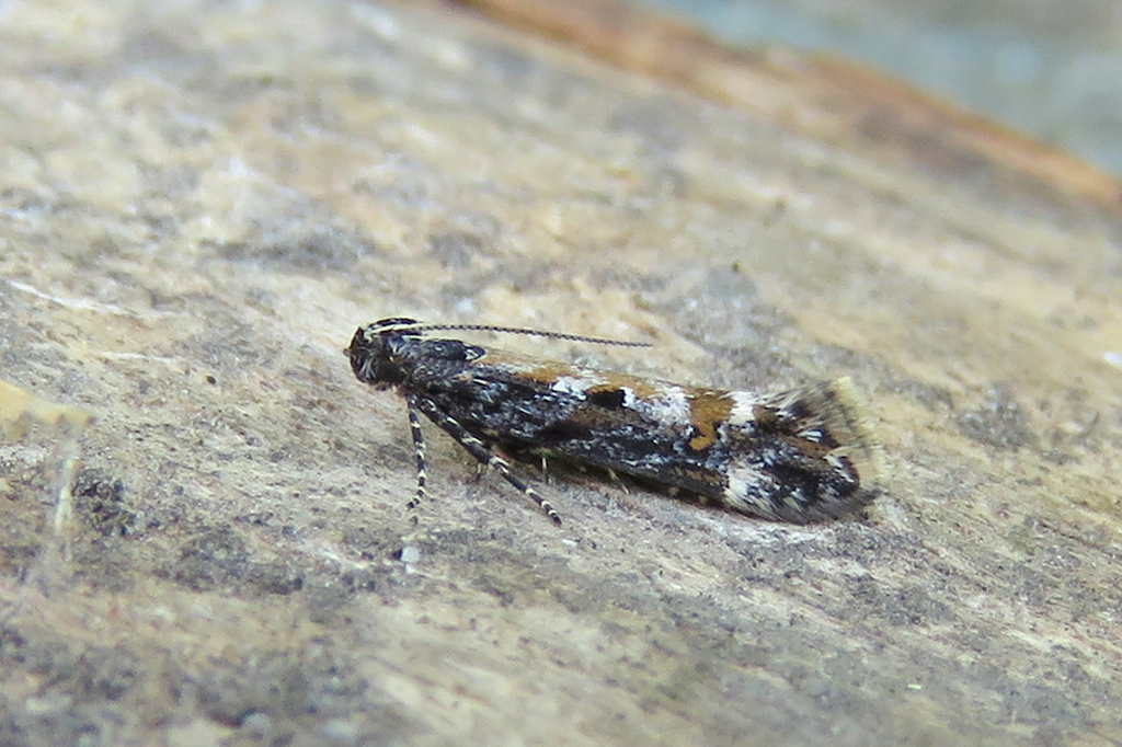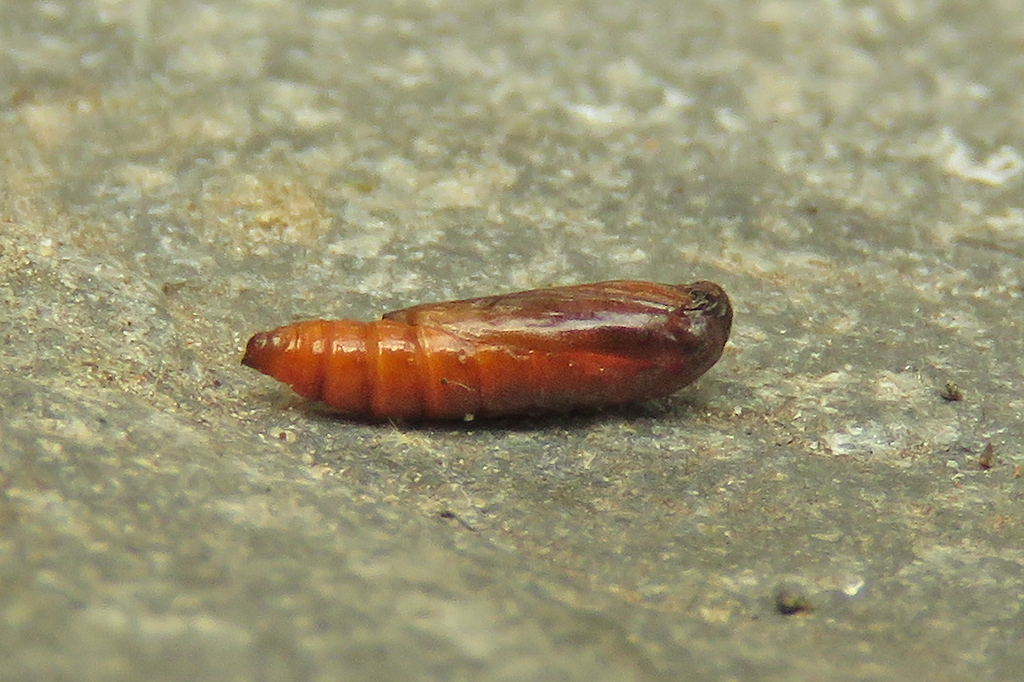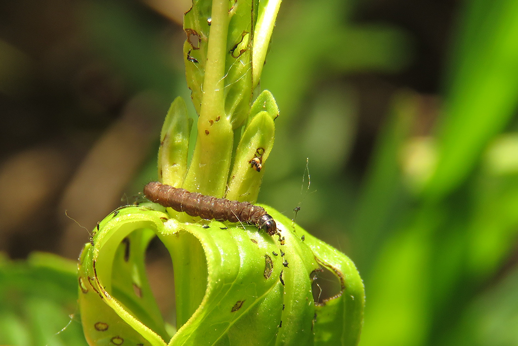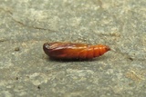 Head and prothoracic plate black, pair of small white lateral spots on thoracic segment II, four white small spots at incision between thoracic segment III and abdomen; abdomen dull reddish to reddish brown; pinacula tiny; anal plate blackish; thoracic legs blackish (Gregersen & Karsholt 2022).