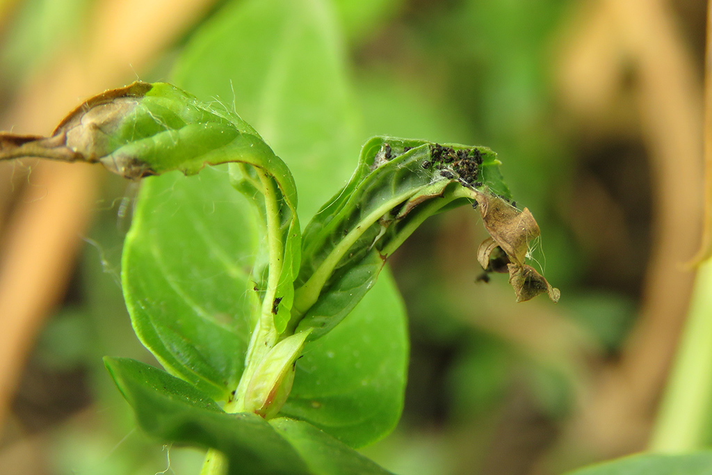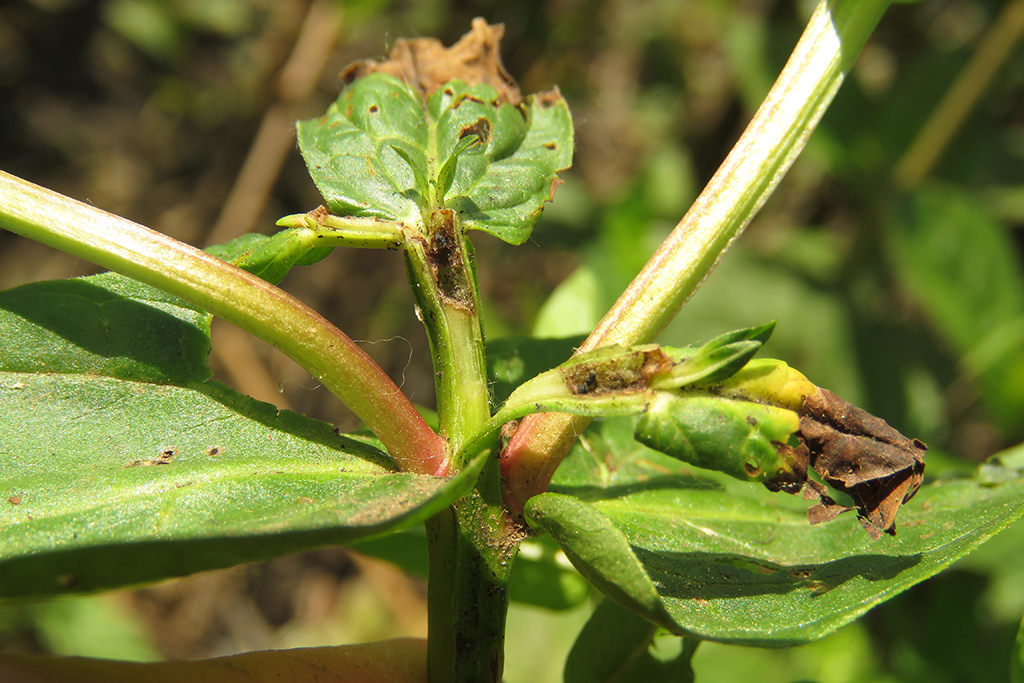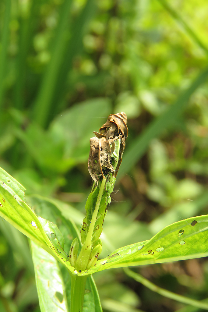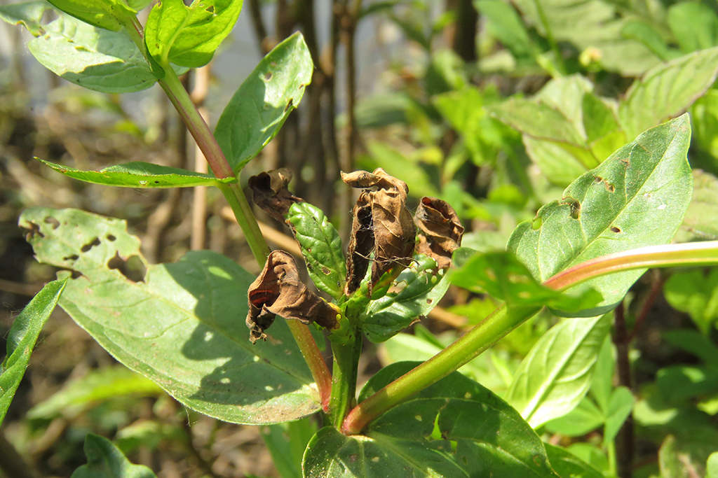 The caterpillars live in the tops of fresh shoots, where the top leaves are spun together (and change color). Black, conspicious frass are extruded from the larval habitation. The caterpillar itself withdraws to the heart of the shoot and even bores a little downward into the stem top.