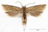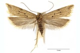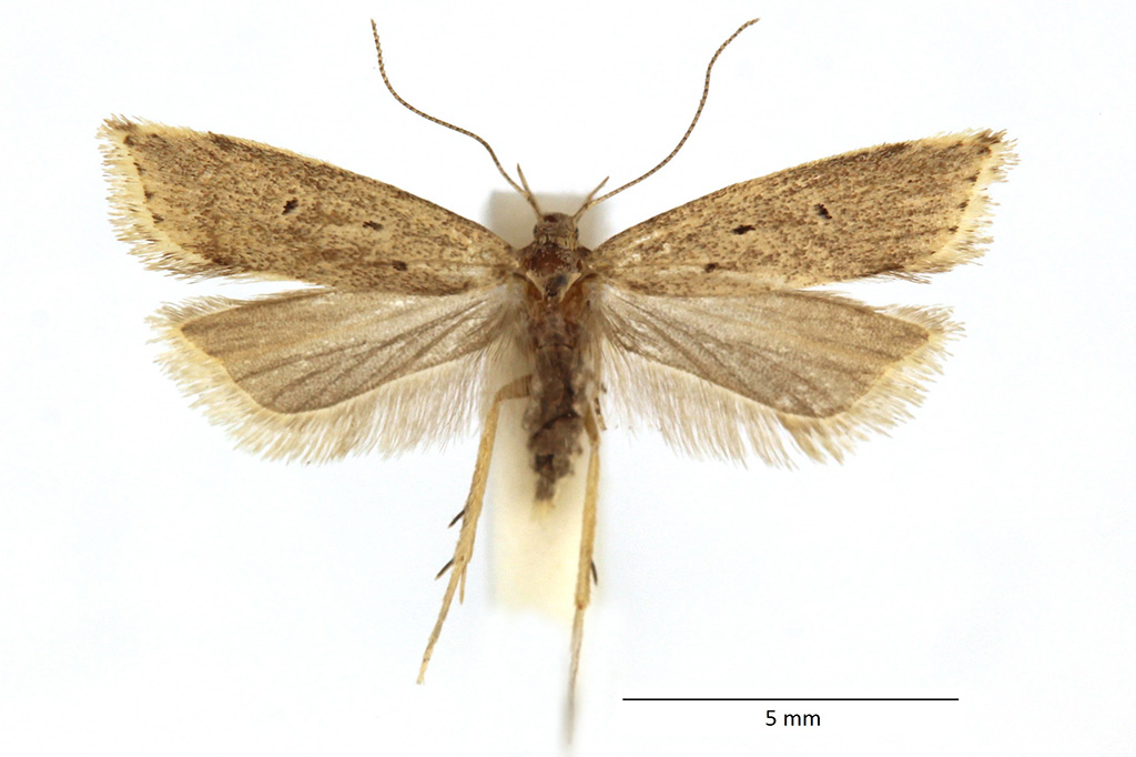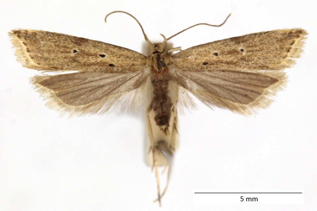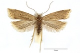 Head dark brown; prothoracic plate brown, mottled darker posteriorly with a narrow, whitish medial division; abdomen whitish, suffused pale brownish; a more or less disntinct, narrow brown dorsal line; anal plate sub-oval, brown; prolegs semi-translucent greyish-brown; pinacula brown (Gregersen & Karsholt 2022).