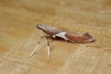 At first a rather long serpentine mine at the underside of the leaf, most of the time parallel with the main vein, but later on turning to the leaf margin where it is widened into a small whitish blotch. The caterpillar in this blotch starts eating the parenchyma and spins the mine into a tentiform shape which after a while turns brownish. Later instars leave the mine and spin a tip of the leaf downwards. The last instar spins the leaf downwards into a leaf roll.