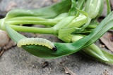 The larva makes a long and broad gallery along the mid-rib towards the tip of the leaf, continuing to the margins, with frass in broad lines deposited. After overwintering the mature larvae live between two leaves which are spun together along the margins.