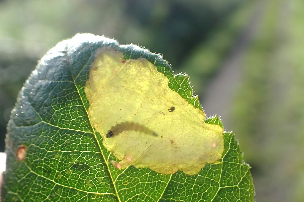 The eggs are oviposited on the upper side of a leaf. In many cases, each leaflet of leaf contains one egg. Leaves close to the ground are preferred. The last instar caterpillar applies some spinning inside the mine, causing the leaflet to fold lengthwise and envelop the entire mine.