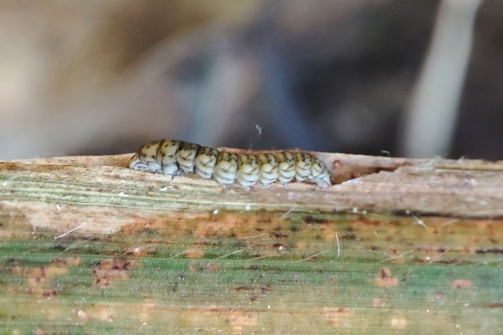 The larva makes a long and slender, irregular gallery with a central tubular retreat of silk admixed with frass in several species of Poaceae.