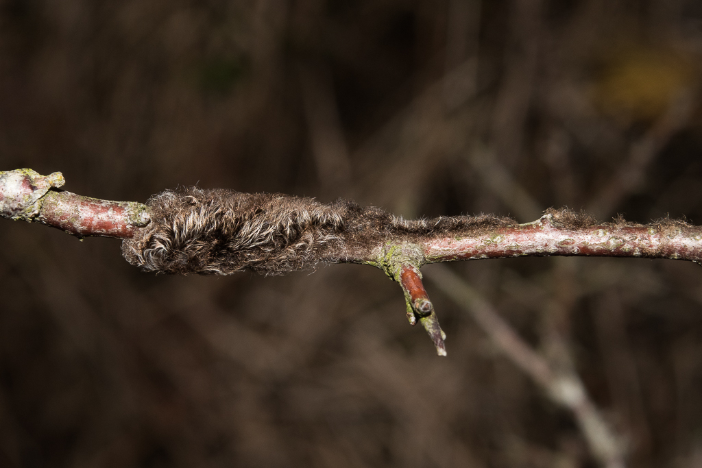 The caterpillars of the first larval stage hatch in April, which is phenologically correlated with the stage of fully developed buds in blackthorn. After hatching, the young caterpillars build a silky coating together on a branch, which provides protection against predators and helps maintain optimal body temperature in cool spring conditions, the nest has an important role in the thermoregulation of the colony.
