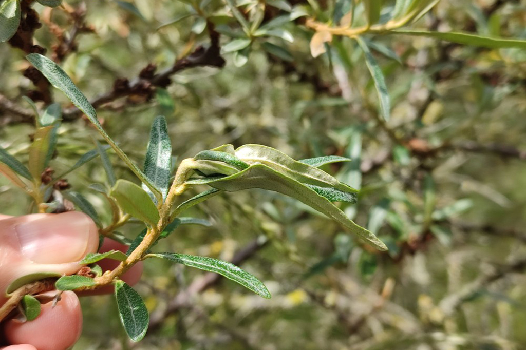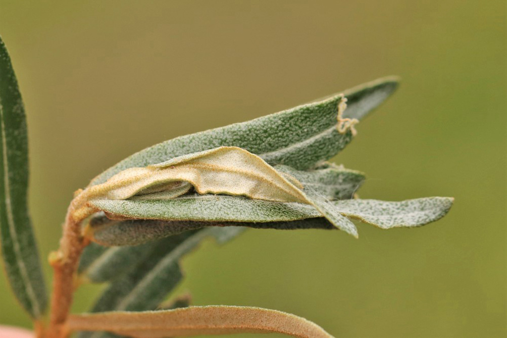 The larva lives monophagously on Hippophae rhamnoides.