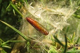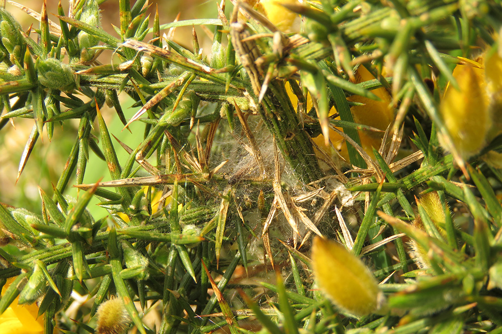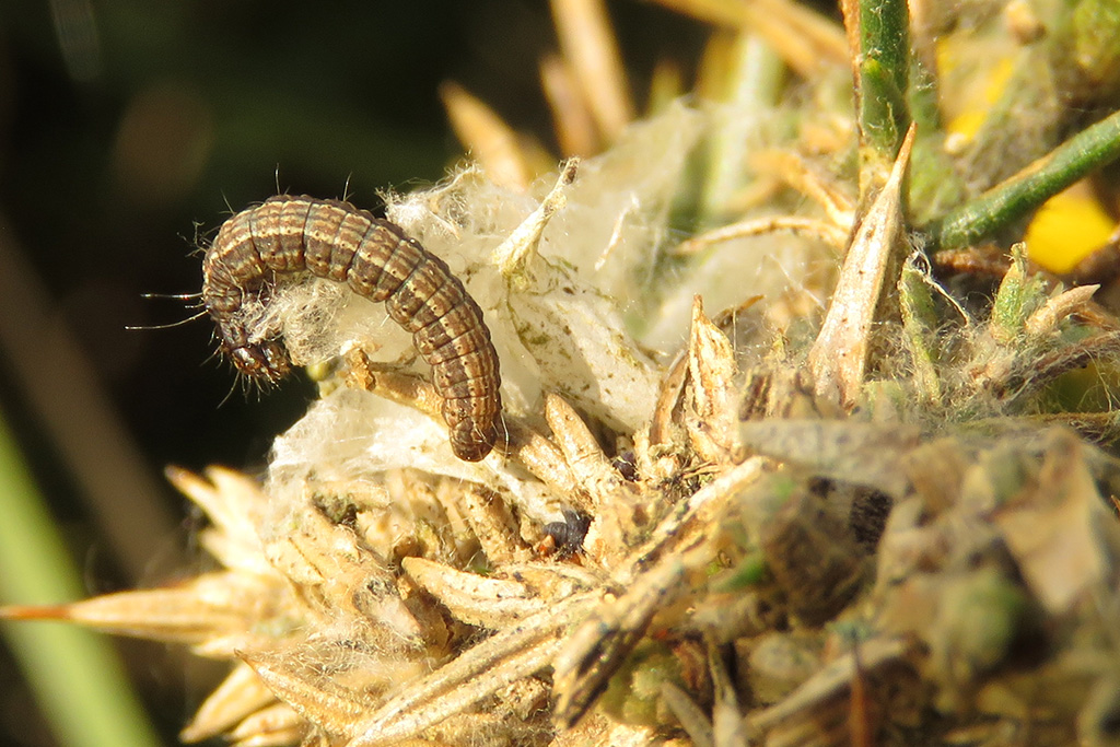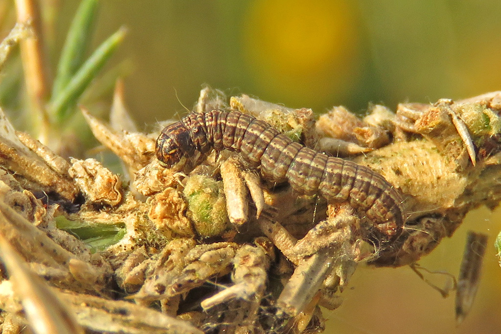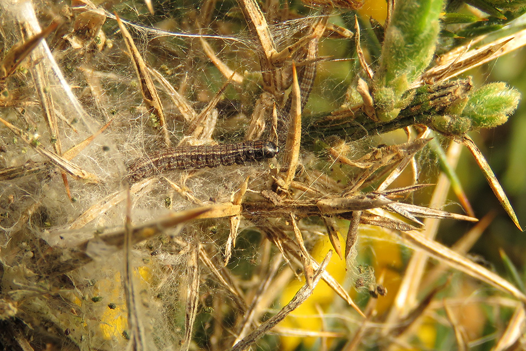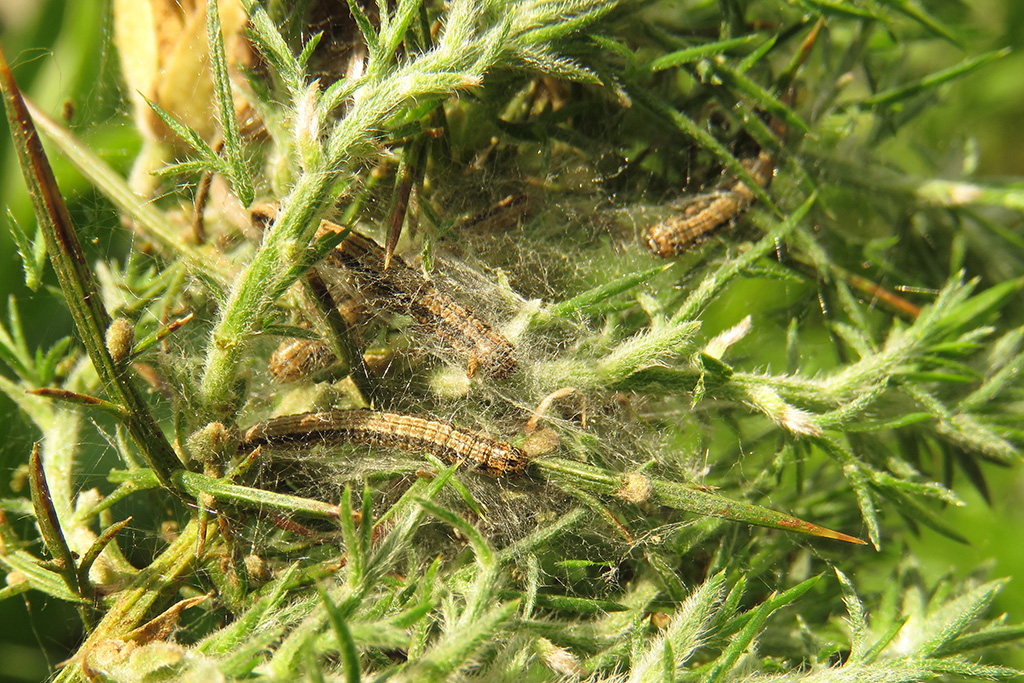 The social living larvae feed on the needles of Ulex europaeus in which they spin a dense, conspicuous web structure. The adults come to light.